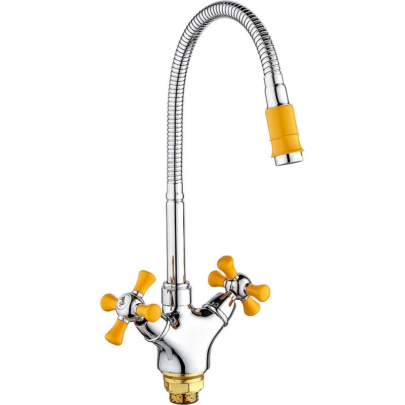 Смеситель для кухни Ростовская Мануфактура Сантехники SL92YW-279F.Характеристики: Цвет: хром, желтый. Материал: цинковый сплав. Управление: двухвентильное. Излив: высокий поворотный гибкий. Механизм работы: кран-букса латунная с керамическими пластинами, угол поворота 180 градусов. Крепление: гайка. Аэратор: пластиковый. Монтаж: на мойку. В комплекте поставки: Смеситель. Гибкая подводка.