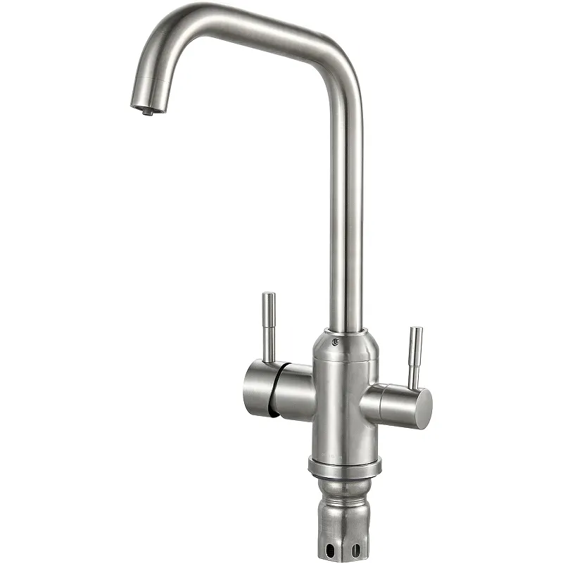 Смеситель для кухни Ростовская Мануфактура Сантехники SUS124-017F-015.Характеристики: Цвет: нержавеющая сталь. Материал: нержавеющая сталь. Керамический картридж. Однорычажный. Излив: поворотный. Стандарт подводки: G1/2. Тип подводки: гибкая. Монтаж: на раковину. С отдельным каналом для подачи фильтрованной воды. В комплекте поставки: Смеситель. Гибкая подводка.