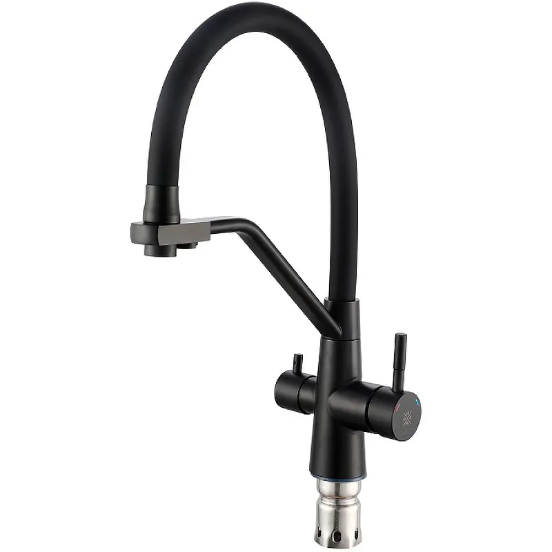 Смеситель для кухни Ростовская Мануфактура Сантехники SUS127TBL-016F-015 с краном для питьевой воды.Характеристики: Цвет: черный. Материал: нержавеющая сталь. Управление: однорычажное. Механизм: керамический картридж 35 мм. Излив: поворотный, гибкий, с каналом для питьевой воды. Стандарт подводки: G1/2. Тип подводки: гибкая в металлической оплетке, длиной 600 мм. Пропускная способность: до 22 л/мин. Аэратор. Функция экономии воды. Тип крепления: гайка. Монтаж: на мойку, на столешницу. В комплекте поставки: Смеситель для кухни. Гибкая подводка. Комплект креплений. Паспорт.