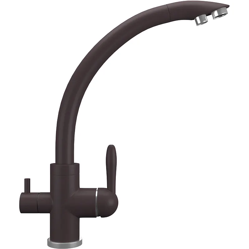 Смеситель для кухни Ulgran Quartz UQ-017-06.Характеристики: Цвет: трюфель. Материал: латунь. Покрытие под искусственный камень. Управление: однорычажное. Излив: поворотный (вращение на 360 градусов) с каналом для питьевой воды. Механизм: керамический картридж Wanhai 35 мм. Для крана с питьевой водой: кран-букса с керамическими пластинами. Тип подводки: гибкая подводка. Стандарт подводки: 1/2. Минимальное давление: 0.5 бар. Рабочее давление: 2-4 бар. Максимальное давление: 6 бар. Аэратор. Отверстие для монтажа: 35 мм. Монтаж: на мойку, на столешницу. В комплекте поставки: Смеситель в фирменной коробке. Гибкая подводка 450 мм. Керамический картридж Wanhai. Крепление. Кран-букса с керамическими пластинами для дополнительного излива для фильтрованной воды. Набор для подсоединения фильтра питьевой воды (гибкая подводка + переходник-цанга). Технический паспорт, гарантийный талон.
