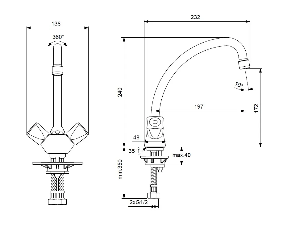 VIDIMA PRACTIC Смеситель для кухонной мойки, система монтажа EASY-FIX (облегченный монтаж), керамические кранбуксы производство Германия с поворотом 180 ̊, пластиковые рукоятки, индикатор холодной/горячей воды, трубчатый поворотный излив 197 мм, угол поворота 360 ̊, аэратор Perlator, подводка гибкая G1/2", шланги стандартной длины 400 мм, дополнительная пластиковая монтажная накладка для лучшей установки на стальной мойке