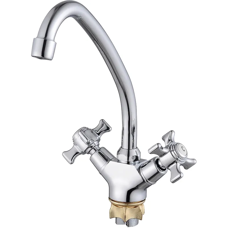 Смеситель для кухни Viko V-1103.Характеристики: Цвет: хром. Материал: латунь. Механизм: керамическая кран-букса. Управление: двухвентильное. Поворотный излив. Монтаж: на мойку. Стандарт подводки: G 1/2. Тип подводки: гибкая. Крепление: латунная гайка. В комплекте поставки: Смеситель. Гибкая подводка. Крепление.
