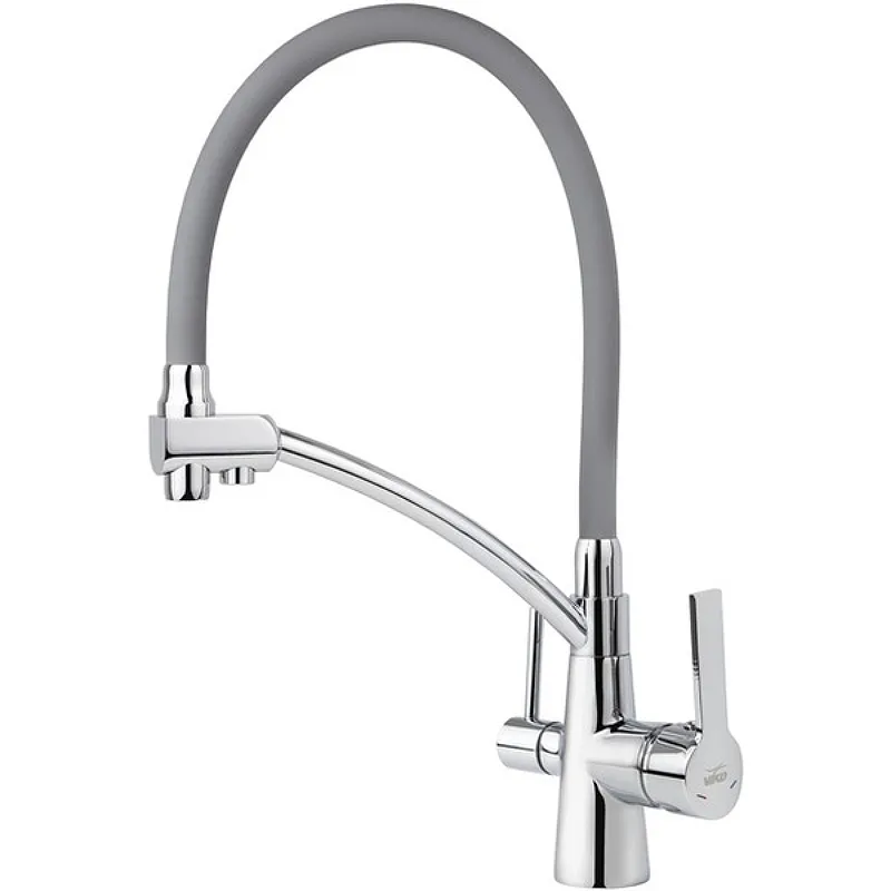 Смеситель для кухни Viko V-5524 с краном для питьевой воды.Характеристики: Цвет: хром, серый. Материал: латунь. Управление: рычажное. Излив: поворотный, гибкий, с каналом для питьевой воды. Механизм: керамический картридж. Стандарт подводки: G 1/2. Тип подводки: гибкая. Монтаж: на мойку, на столешницу. В комплекте поставки: Смеситель для кухни. Гибкая подводка. Аэратор. Паспорт.