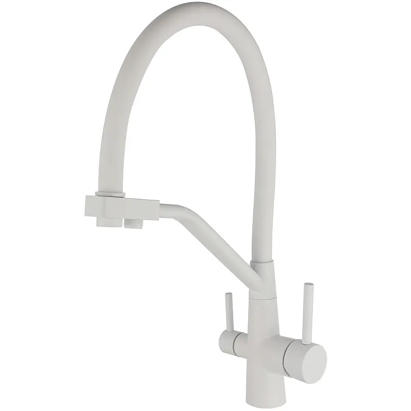 Смеситель для кухни Viko V-5844 с краном для питьевой воды.Характеристики: Цвет: белый матовый. Материал: латунь. Управление: рычажное. Излив: поворотный, гибкий, с каналом для питьевой воды. Механизм: керамический картридж. Стандарт подводки: G 1/2. Тип подводки: гибкая. Монтаж: на мойку, на столешницу. В комплекте поставки: Смеситель для кухни. Гибкая подводка. Аэратор. Паспорт.