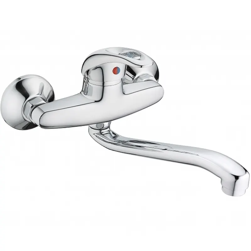 Настенный смеситель для кухни Viko V-6906.Характеристики: Цвет: хром. Материал: силумин. Механизм: керамический картридж. Управление: рычажное. Тип излива: поворотный. Тип подводки: жесткая. Стандарт подводки: G 1/2. Монтаж: на стену. В комплекте поставки: смеситель для кухни.