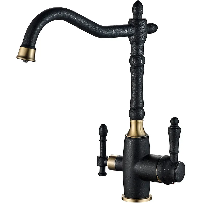 - Современный дизайн кухни: Черный матовый и бронзовый цвета придают смесителю стильный и современный вид.