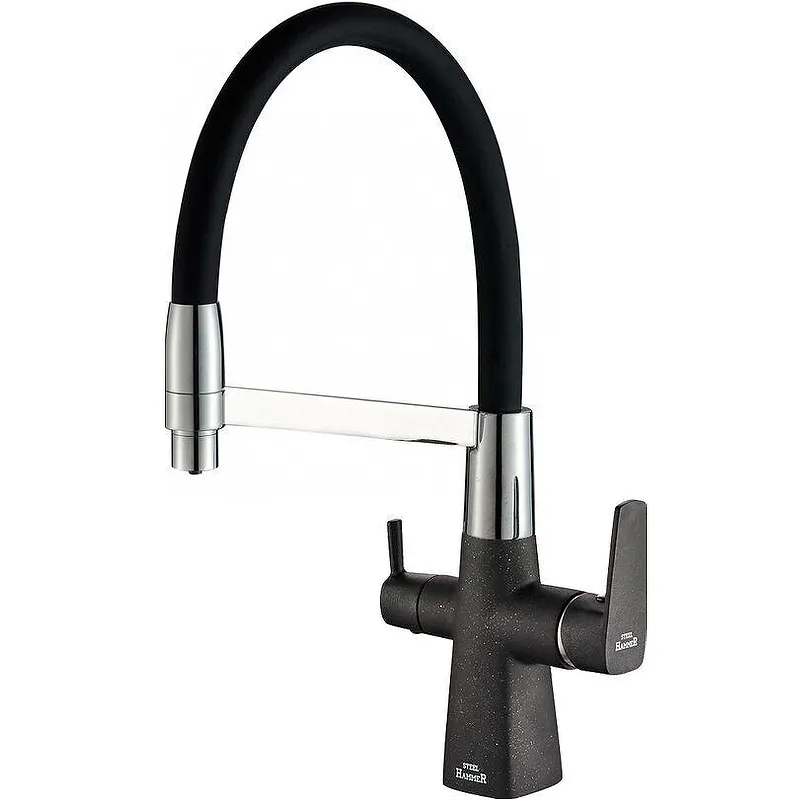 Смеситель для кухни ZorG Steel Hammer SH 818-6 BLACK CR с краном питьевой воды.Характеристики: Цвет: черный матовый, хром. Покрытие: гранит матовый. Материал: латунь. Механизм: керамический картридж. Управление: однорычажное. Излив: поворотный, гибкий, с каналом для питьевой воды. Стандарт подводки: 1/2. Тип подводки: гибкая. Монтаж: на мойку, на столешницу. Отверстий для монтажа: 1. Аэратор. Универсальное цанговое подключение к фильтру. В комплекте поставки: Смеситель. Гибкая подводка 45 см. Комплект креплений. Переходник-цанга для подключения фильтра.