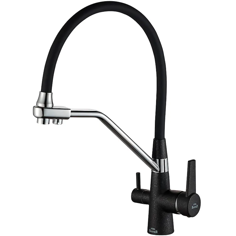 Смеситель для кухни Zorg Steel Hammer SH 903-6 BLACK CR.Характеристики: Поворотный излив, под фильтр 2 в 1. Материал: латунь. Цвет: чёрный матовый, хром. Покрытие: гранит матовый. Управление: рычажное. Стандарт подводки: 1/2. В комплекте поставки: Смеситель. Переходник-цанга для подключения фильтра. Крепления. Гибкая подводка 45см. Инструкция.