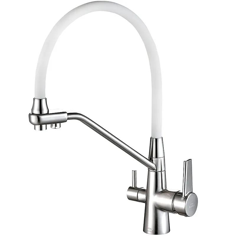 Смеситель для кухни Zorg Steel Hammer SH 903-8 CR.Характеристики: Поворотный излив, под фильтр 2 в 1. Материал: латунь. Цвет: хром, белый. Управление: рычажное. Стандарт подводки: 1/2. В комплекте поставки: Смеситель. Переходник-цанга для подключения фильтра. Крепления. Гибкая подводка 45 см. Инструкция.