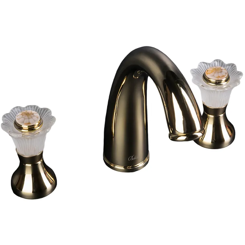 Смеситель для раковины Boheme Camelia 297.Характеристики: Цвет: золото. Материал: латунь. Ручки: хрусталь. Управление: двухвентильное. Механизм: керамическая кран-букса. Излив: фиксированный. Аэратор. Тип подводки: гибкая. Стандарт подводки: 1/2. Отверстия для монтажа: 3. Монтаж: на раковину / на столешницу. В комплекте поставки: Смеситель для раковины. Гибкая подводка. Комплект креплений.