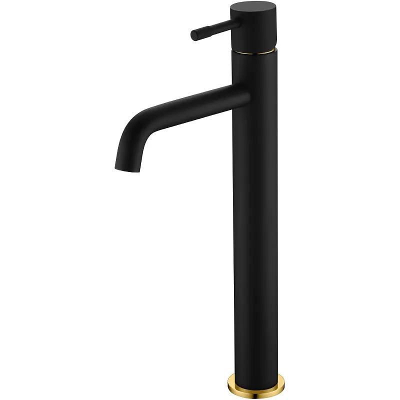 Смеситель для раковины Boheme Uno 462-BG.Характеристики: Цвет: черный, золото. Покрытие: матовое. Материал: латунь. Излив: фиксированный. Управление: однорычажное. Механизм: керамический картридж. Тип подводки: гибкая подводка. Стандарт подводки: 1/2. Монтаж: на раковину. Отверсти для монтажа: 1. В комплекте поставки: Смеситель. Аэратор. Гибкая подводка.