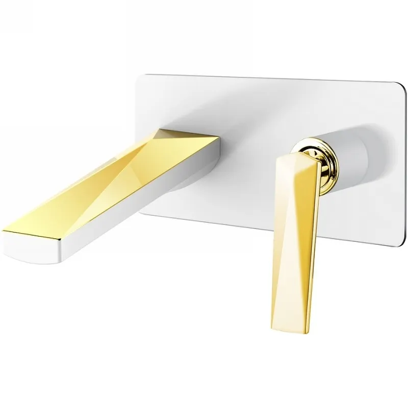 Смеситель для раковины Boheme Venturo 385-W.Характеристики: Цвет: белый, золото. Материал: латунь. Управление: однорычажное. Механизм: керамический картридж. Излив: фиксированный. Аэратор. Стандарт подводки: 1/2. Отверстия для монтажа: 1. Монтаж: встраиваемый. В комплекте поставки: Смеситель (внешняя и внутренняя часть). Комплект креплений.