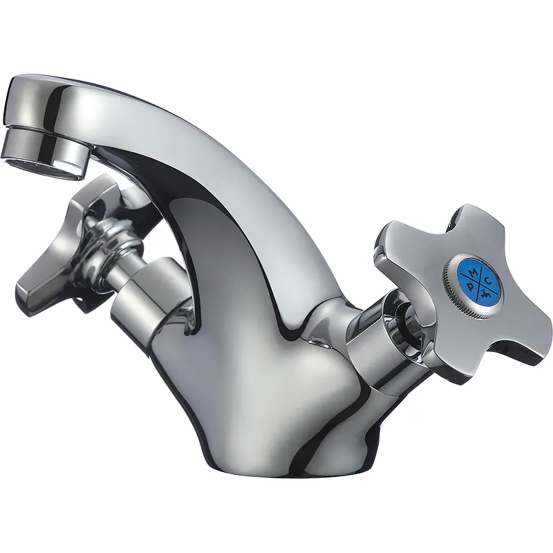 Смеситель для раковины Ростовская Мануфактура Сантехники SL115-161.Характеристики: Цвет: хром. Материал: цинковый сплав. Управление: двухвентильное. Излив: фиксированный литой. Механизм работы: кран-букса латунная с керамическими пластинами, угол поворота 180 градусов. Стандарт подводки:G 1/2. Тип подводки: гибкая. Крепление: шпилька. Аэратор: пластиковый. Монтаж: на раковину. В комплекте поставки: Смеситель. Гибкая подводка.