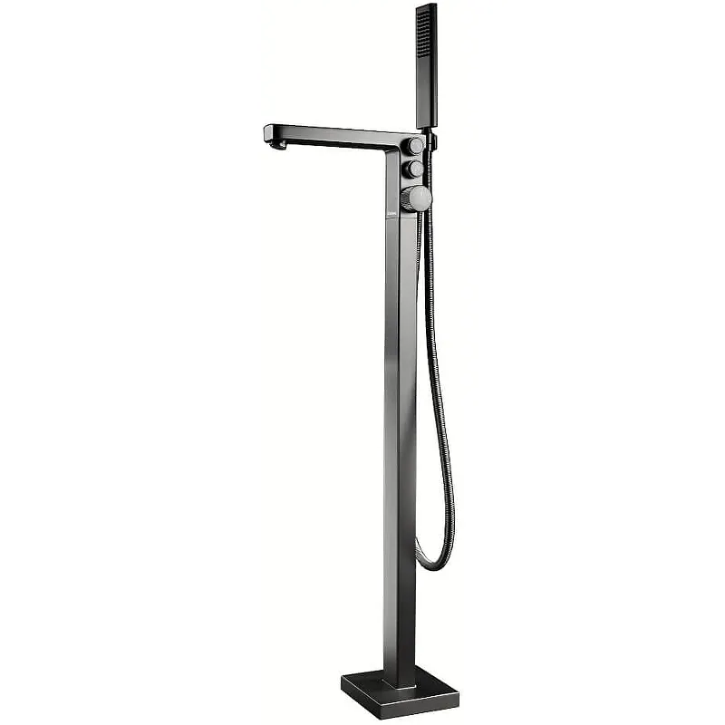 Смеситель для ванны Black&White Universe 7562gm напольный с душевым гарнитуром.Характеристики: Цвет: темно-серый матовый, гранит. Материал: латунь. С аэратором Neoperl. Управление: кнопочное. Вращение излива: фиксированный. Длина шланга: 150 см. Стандарт подводки: G 1/2. Количество режимов ручного душа: 1. Механизм: керамический картридж. Монтаж: напольный. В комплекте поставки: Смеситель. Стойка. Душевая лейка. Душевой шланг.