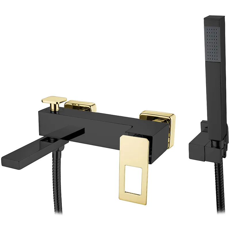 Смеситель для ванны Boheme Q 143-BG с душевым гарнитуром.Характеристики: Цвет: черный, золото. Материал: латунь. Управление: однорычажное. Механизм: керамический картридж. Излив: поворотный. Стандарт подводки: G 1/2. Тип подводки: жесткая. Аэратор. Встроенный девиатор: автоматически переключающий поток с душа на излив при закрытии воды. Функция экономии расхода воды. Количество режимов струи ручного душа: 1. Длина душевого шланга: 1500 мм. Монтаж: на стену. В комплекте поставки: Смеситель для ванны. Ручной душ. Душевой шланг. Держатель ручного душа. Комплект эксцентриков. Комплект креплений.