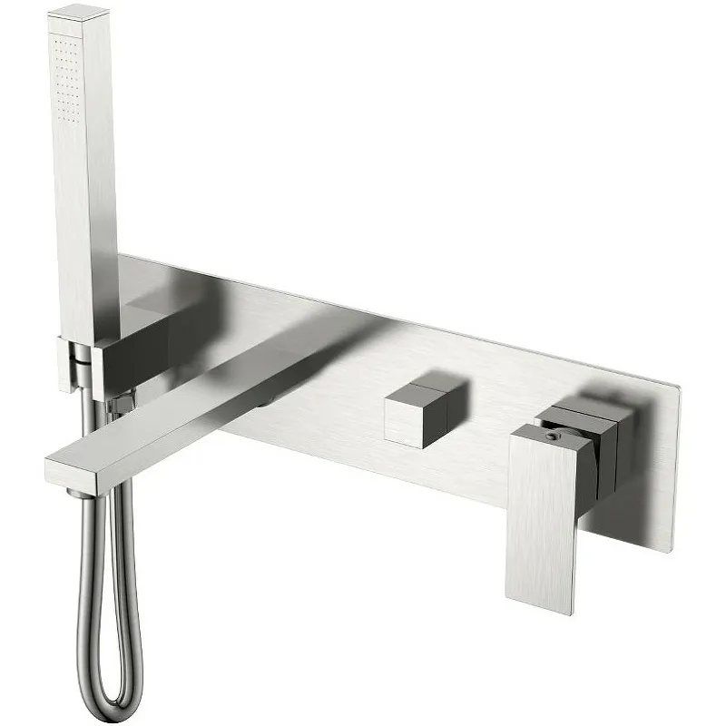 Смеситель для ванны Boheme Qubic 474-2-NB с душевым гарнитуром.Характеристики: Цвет: никель брашированный. Материал: латунь. Управление: однорычажное. Механизм: керамический картридж Sedal. Излив: фиксированный. Аэратор Neoperl Cascade. Количество режимов струи ручного душа: 1. Длина душевого шланга: 150 см. Стандарт подводки: 1/2. Отверстия для монтажа: 1. Монтаж: встраиваемый. В комплекте поставки: Смеситель (внешняя и внутренняя часть). Ручной душ. Душевой шланг. Держатель ручного душа. Комплект креплений.