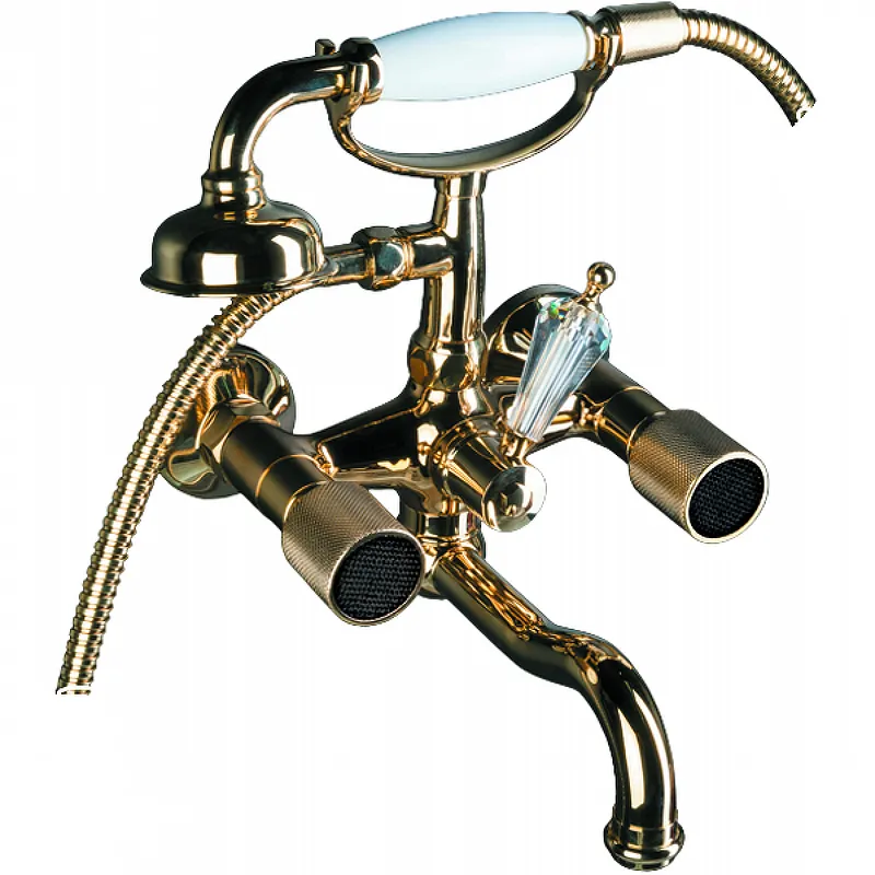 Смеситель для ванны Boheme Royal Cristal 293-Royal/CRST black с душевым гарнитуром.Характеристики: Цвет: золото. Ручки декорированы кристаллами Preciosa черного цвета. Переключатель кристалл Swarovski. Материал: латунь. Управление: двухвентильное. Механизм: керамическая кран-букса. Излив: поворотный. Стандарт подводки: G 1/2. Переключатель потоков. Аэратор. Длина душевого шланга: 1500 мм. Количество режимов струи ручного душа: 1. Монтаж: на стену. В комплекте поставки: Смеситель для ванны. Ручной душ. Душевой шланг. Держатель ручного душа. Эксцентрики. Комплект креплений.