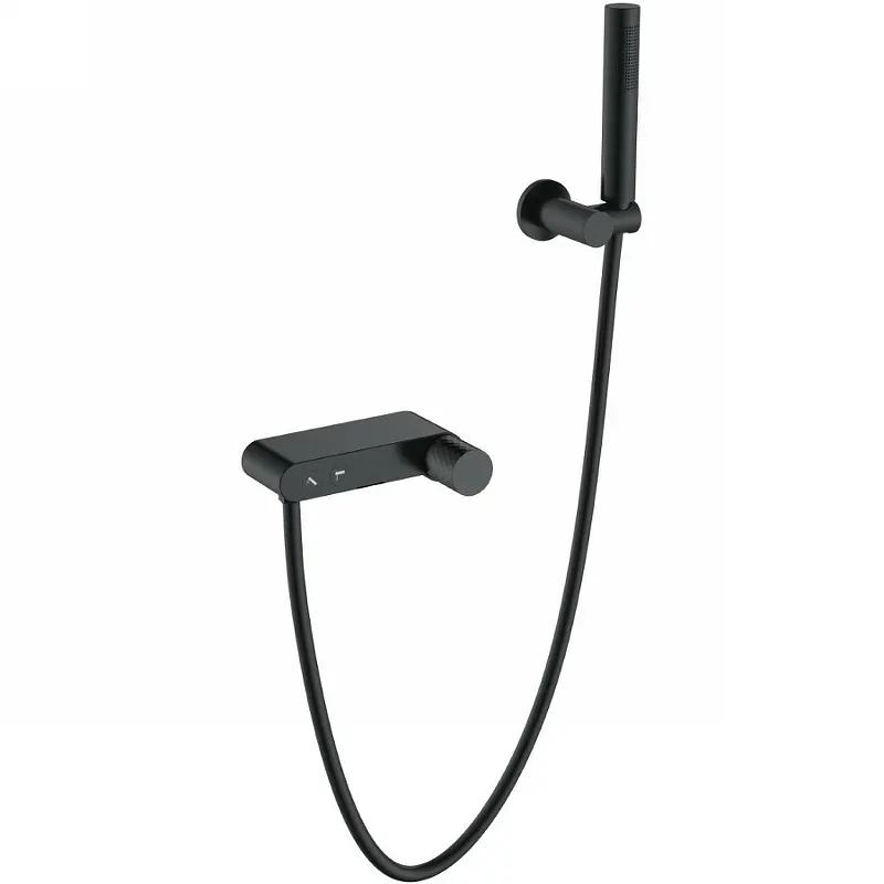 Смеситель для ванны Boheme Stick 123-BB с душевым гарнитуром.Характеристики: Цвет: черный матовый. Ручка: Diamond. Материал: латунь. Управление: однорычажное. Механизм: керамический картридж. Излив: фиксированный. Тип излива: каскадный (расположен снизу на корпусе). Стандарт подводки: G 1/2. Тип подводки: жесткая. Количество режимов струи ручного душа: 1. Монтаж: на стену. В комплекте поставки: Смеситель для ванны. Ручной душ. Душевой шланг. Держатель ручного душа. Комплект креплений.