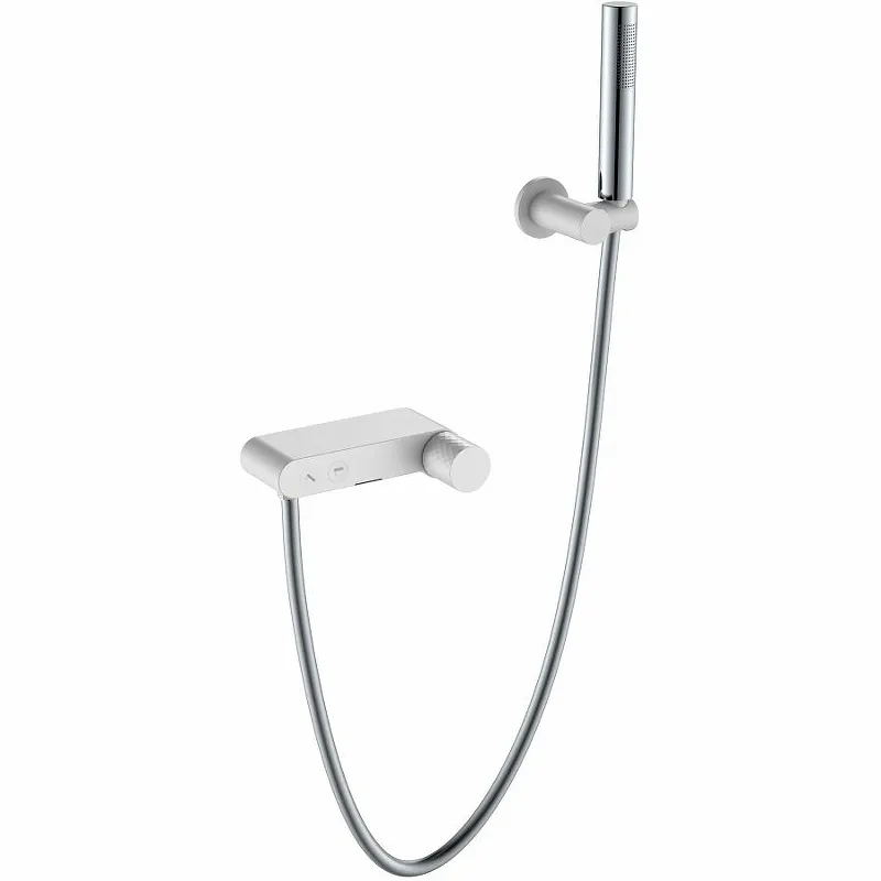 Смеситель для ванны Boheme Stick 123-WCR с душевым гарнитуром.Характеристики: Цвет: белый матовый, хром. Ручка: Diamond. Материал: латунь. Управление: однорычажное. Механизм: керамический картридж. Излив: фиксированный. Тип излива: каскадный (расположен снизу на корпусе). Стандарт подводки: G 1/2. Тип подводки: жесткая. Количество режимов струи ручного душа: 1. Монтаж: на стену. В комплекте поставки: Смеситель для ванны. Ручной душ. Душевой шланг. Держатель ручного душа. Комплект креплений.
