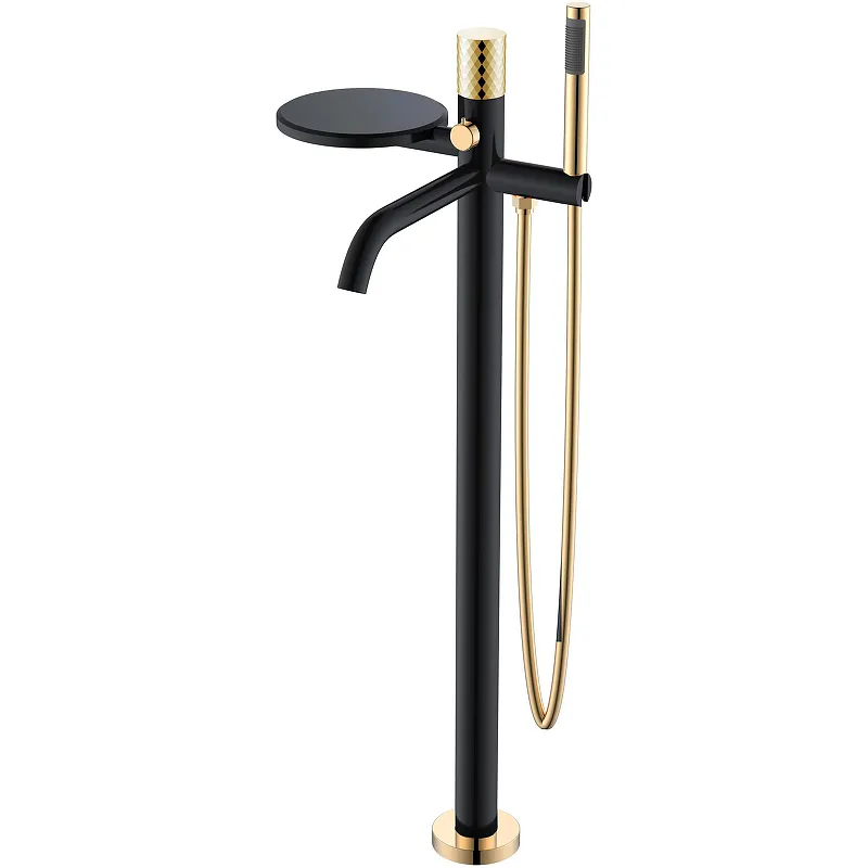 Смеситель для ванны Boheme Stick 129-BG с душевым гарнитуром.Характеристики: Цвет: черный матовый, золото. Ручка: Diamond. Материал: латунь. Управление: однорычажное. Механизм: керамический картридж. Излив: фиксированный. Стандарт подводки: G 1/2. Количество режимов струи ручного душа: 1. Монтаж: на пол. В комплекте поставки: Смеситель для ванны. Ручной душ. Душевой шланг. Держатель ручного душа. Полочка. Комплект креплений.