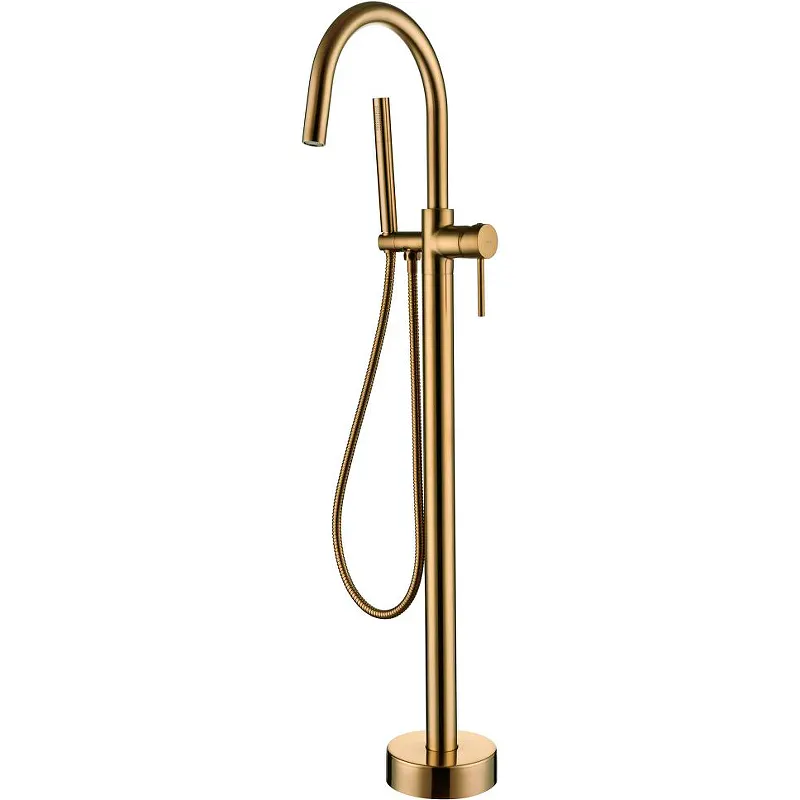 Смеситель для ванны с душем Boheme Uno 469-MG.Характеристики: Цвет: золото. Покрытие: матовое. Управление: рычажное. Душевой гарнитур в комплекте. Поворотный излив. Девиатор. Материал: латунь. Механизм: керамический картридж. Стандарт подводки: гибкая подводка G1/2. Монтаж: напольный. В комплекте поставки: Смеситель. Лейка. Шланг. Гибкая подводка G1/2. Крепежный комплект.