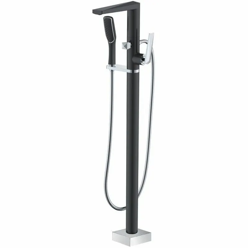 Смеситель для ванны Boheme Venturo 379-B напольный.Характеристики: Цвет: черный, хром. Материал: латунь. Управление: однорычажное. Механизм: керамический картридж. Излив: фиксированный. Аэратор. Встроенный девиатор, автоматически переключающий поток с душа на излив при закрытии воды. Количество режимов струи ручного душа: 1. Длина душевого шланга: 150 см. Стандарт подводки: 1/2. Отверстия для монтажа: 1. Монтаж: напольный. В комплекте поставки: Смеситель. Душевой шланг. Ручной душ. Держатель для душевой лейки. Крепления.