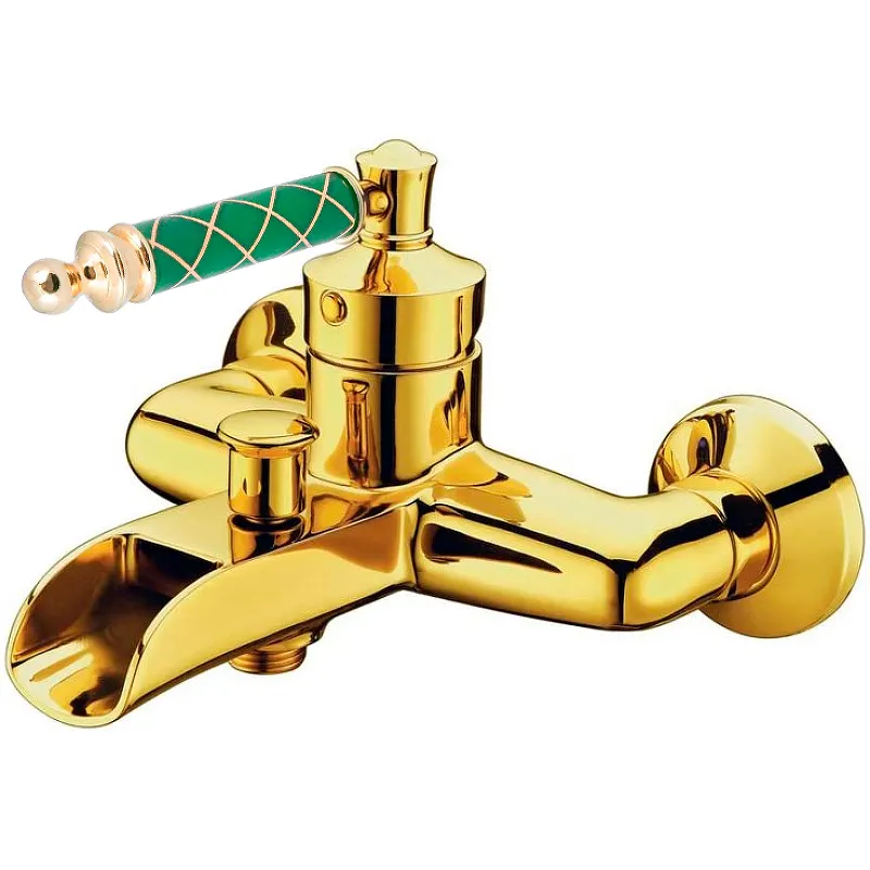 Смеситель для ванны Boheme Vogue 213-MR-GR.Характеристики: Цвет: золото. Материал: латунь. Ручка: стекло Murano, цвет бирюзовый. Управление: однорычажное. Механизм: керамический картридж. Излив: фиксированный, каскадный. Стандарт подводки: G 1/2. Тип подводки: жесткая. Девиатор. Монтаж: на стену. В комплекте поставки: Смеситель для ванны. Эксцентрики. Комплект креплений.