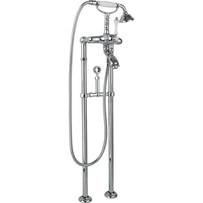 Смеситель для ванны Cezares Margot MARGOT-VDPS-01-Bi напольный с душевым гарнитуром.Характеристики: Цвет: хром. Цвет ручек: белый Материал: латунь. Управление: однорычажное. Механизм: керамический картридж. Излив: фиксированный. Аэратор. Дивертор. Форма ручного душа: круглая. Количество режимов струи ручного душа: 1. Длина душевого шланга: 1500 мм. Стандарт подключения: G 1/2. Отверстия для монтажа: 2. Рабочий интервал давления в водопроводной сети: 0.5-6.0 Атм. Монтаж: напольный. В комплекте поставки: Смеситель для ванны. Ручной душ. Душевой шланг. Держатель ручного душа. Универсальный установочный комплект.