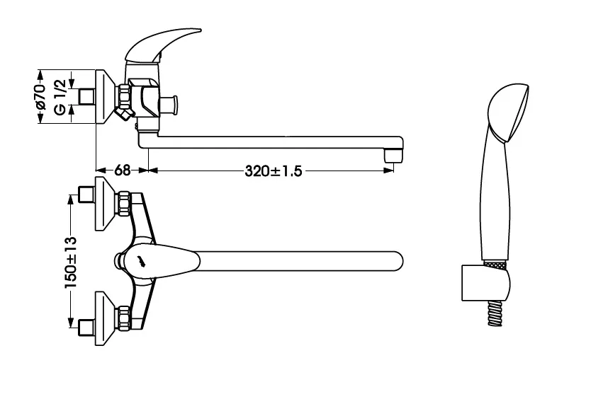 ORION Однорукоятковый настенный смеситель для ванны/душа, монтаж на стандартных эксцентриках (в комплекте: эксцентрики, металлические отражатели, уплотнительные прокладки), трубчатый поворотный излив 320 мм, угол поворота 360 ̊, аэратор Perlator, керамический картридж 35 мм, металлическая рукоятка с индикаторами горячей / холодной воды, ручное переключение ванна/душ, душевой гарнитур в комплекте (душевая лейка Ø70 мм, металлический шланг 1500 мм, держатель для лейки)