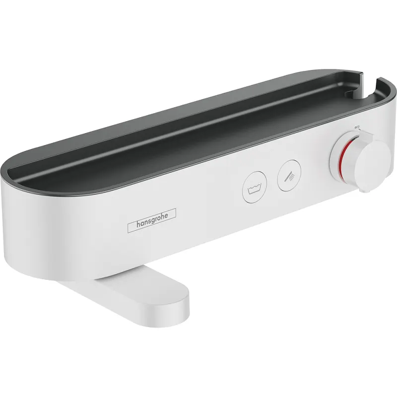 Смеситель для ванны Hansgrohe ShowerTabletSelect 400 24340700 с термостатом.Характеристики: Цвет: белый матовый. Материал: латунь. Управление: термостат. Механизм: термостатический картридж, клапан Select. Поворотный излив. Регулировка температуры и напора. Регулируемое ограничение температуры. Предохранительный ограничитель при 40 градусах. Кнопка Select включения / выключения для 2 потребителей. CoolContact термостат: предотвращает нагрев корпуса, делая принятие душа еще безопаснее. Контроль напора регулирует до 30 процентов расхода воды. Максимальный расход воды при 3 барах: 18,7 л/мин. Расход воды изливом на ванны при 3 барах: 18,7 л/мин. Расход воды ручным душем при 3 барах: 15,9 л/мин. Мин. рабочее давление: 1 бар. Макс. рабочее давление: 10 бар. С изолированной подачей воды. Клапан обратного тока воды. Со встроенной защитной комбинацией EN 1717. С шумопоглотителем. Полка из пластика. Поверхность полочки: графит. Грязеулавливающий фильтр. Стандарт подводки: G1/2. Монтаж: на стену. В комплекте поставки: Смеситель. Комплект креплений.