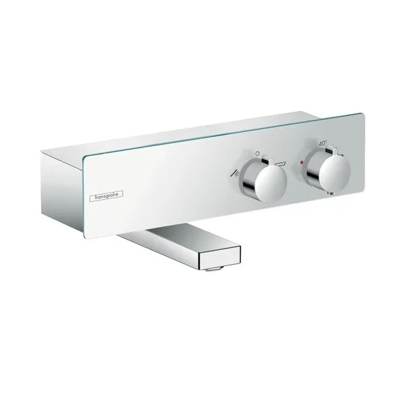 Смеситель для ванны и душа, Hansgrohe, ShowerTablet, тип регулирования воды-термостатический картридж, тип установки-настенный, вынос излива, мм-212, комплектация-с шумопоглотителем, цвет-хром, поверхность полочки: анодированный алюминий, с изолированной подачей воды, клапан обратного тока воды арт-13107000