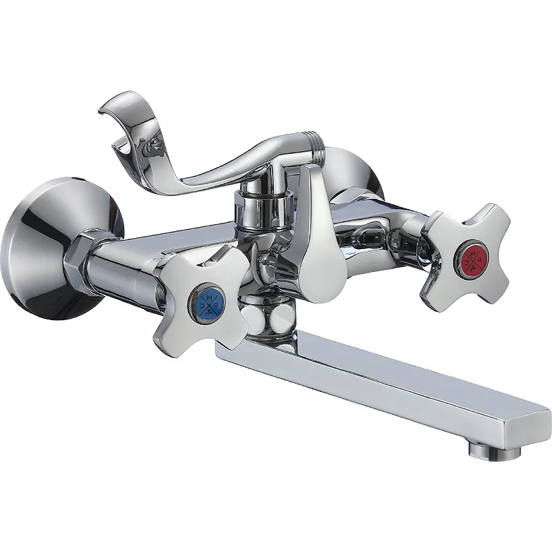 Смеситель для ванны Ростовская Мануфактура Сантехники SL115-142E универсальный.Характеристики: Цвет: хром. Материал: цинковый сплав. Управление: двухвентильное. Излив: поворотный. Переключатель ванна/душ: евро-переключение. Механизм работы: кран-букса латунная с керамическими пластинами, угол поворота 180 градусов. Аэратор: пластиковый. Монтаж: на стену. В комплекте поставки: Смеситель. Шланг для душа. Ручной душ. Эксцентрики. Отражатели.