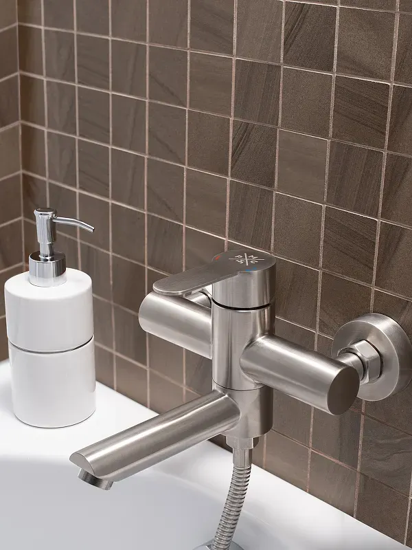 Смеситель для ванны Ростовская Мануфактура Сантехники SUS124-009E.Характеристики: Цвет: нержавеющая сталь. Материал: нержавеющая сталь. Поверхность: матовая. Управление: рычажное. Механизм: керамический картридж 35 мм. Излив: поворотный. Стандарт подводки: 1/2. Тип подводки: жесткая. Отверстия для монтажа: 2. Монтаж: на стену. Аэратор. Переключение на душ: евро. Количество режимов струи ручного душа: 1. Длина душевого шланга: 1.5 м. Пропускная способность: до 22 л/мин. В комплекте поставки: Смеситель. Душевой шланг. Душевая лейка. Держатель лейки. Комплект отражателей. Комплект эксцентриков. Комплект креплений.
