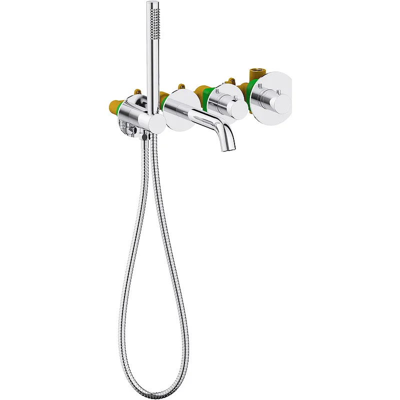 Смеситель для ванны Timo Saona 2324/00YSM с термостатом.Характеристики: Цвет: хром. Материал: латунь. Управление: термостат. Механизм: термостатический картридж. С фиксированным изливом. Количество режимов ручного душа: 1. Длина шланга: 1500 мм. Отверстия для монтажа: 4. Стандарт подключения: G 1/2. Монтаж: встраиваемый. В комплекте поставки: Встраиваемый блок управления смесителем. Декоративные накладки - 4 шт. Соединительные трубки - 2 шт. Гайка. Декоративные гильзы - 2 шт. Держатель ручной лейки с подключением шланга (латунный). Излив. Ручка управления термостатом. Ручка управления дивертором. Ручная лейка (латунная). Шланг душа (латунный). Гаечный ключ. Инструкция.