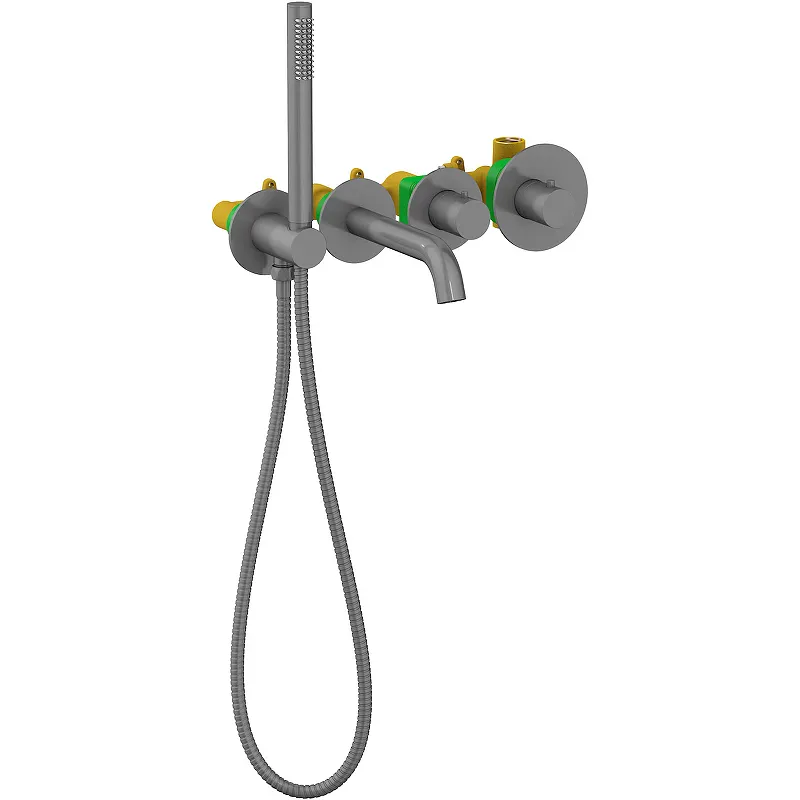 Смеситель для ванны Timo Saona 2324/18YSM с термостатом.Характеристики: Цвет: черное золото. Материал: латунь. Управление: термостат. Механизм: термостатический картридж. С фиксированным изливом. Количество режимов ручного душа: 1. Длина шланга: 1500 мм. Отверстия для монтажа: 4. Стандарт подключения: G 1/2. Монтаж: встраиваемый. В комплекте поставки: Встраиваемый блок управления смесителем. Декоративные накладки - 4 шт. Соединительные трубки - 2 шт. Гайка. Декоративные гильзы - 2 шт. Держатель ручной лейки с подключением шланга (латунный). Излив. Ручка управления термостатом. Ручка управления дивертором. Ручная лейка (латунная). Шланг душа (латунный). Гаечный ключ. Инструкция.
