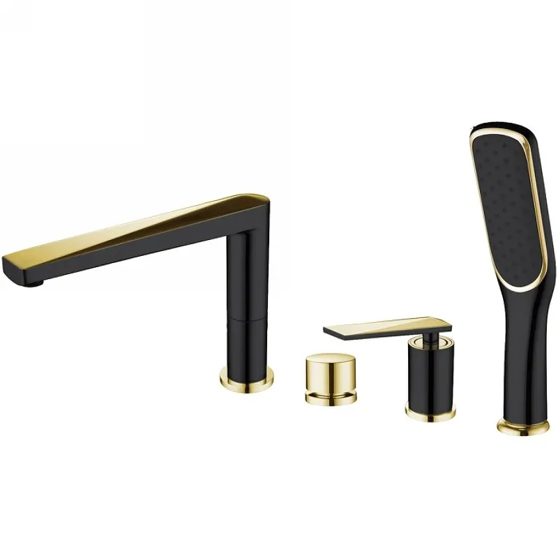 Смеситель на борт ванны Boheme Venturo 380-B с душевым гарнитуром.Характеристики: Цвет: черный, золото. Материал: латунь. Механизм: керамический картридж. Управление: однорычажное. Излив: поворотный. Аэратор. Размер ручного душа (ШхВ): 58х236 мм. Количество режимов струи ручного душа: 1. Стандарт подводки: 1/2. Тип подводки: гибкая. Монтаж: на борт ванны. Отверстия для монтажа: 4. В комплекте поставки: Смеситель. Излив. Душевой шланг. Ручной душ. Держатель ручного душа. Переключатель потоков. Гибкая подводка. Комплект креплений.