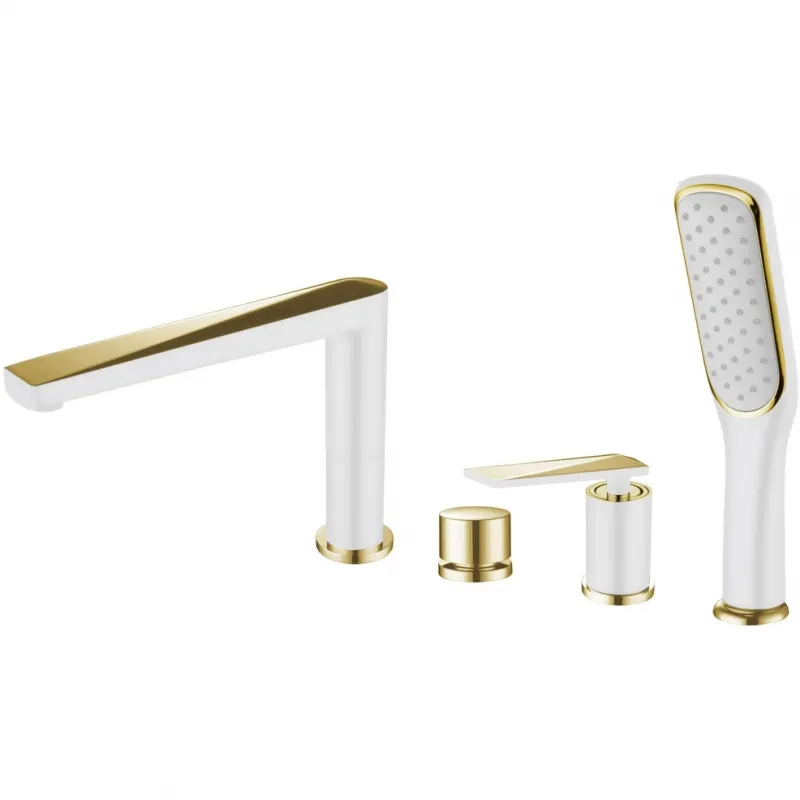Смеситель на борт ванны Boheme Venturo 380-W с душевым гарнитуром.Характеристики: Цвет: белый, золото. Материал: латунь. Механизм: керамический картридж. Управление: однорычажное. Излив: поворотный. Аэратор. Размер ручного душа (ШхВ): 58х236 мм. Количество режимов струи ручного душа: 1. Стандарт подводки: 1/2. Тип подводки: гибкая. Монтаж: на борт ванны. Отверстия для монтажа: 4. В комплекте поставки: Смеситель. Излив. Душевой шланг. Ручной душ. Держатель ручного душа. Переключатель потоков. Гибкая подводка. Комплект креплений.