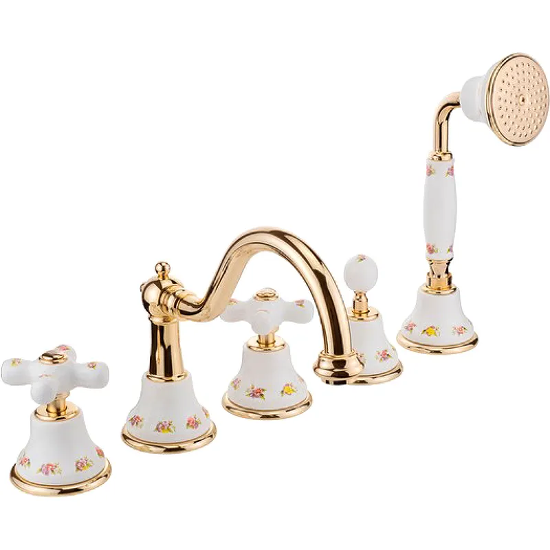 Смеситель на борт ванны Migliore Provance 19480.Станет изысканным украшением Вашей ванной комнаты. Поможет в создании эстетичного и благородного дизайна помещения в классическом или ретро стиле. Отличается округлой формой корпуса и керамическими ручками. Итальянское качество по приемлемой цене.Характеристики: Цвет корпуса: золото. Цвет ручек: белый с декором. Материал: высококачественный латунный сплав, который обеспечивает прочность, устойчивость к влаге и температурным перепадам. Специальное лаковое покрытие защищает внешнюю часть смесителя от быстрого износа. Двухвентильная система управления. Защита от обратного потока. Совместимость с проточным водонагревателем. Крестообразные ручки выполнены из керамики. Керамические кран-буксы. Поворотный излив с аэратором. Отдельный переключатель ванна/душ. Душевой гарнитур: ручной душ, шланг, держатель. Стандарт подключения: G 1/2. Монтаж: на ванну. Отверстий для монтажа: 5. В комплекте поставки: Смеситель. Гибкая подводка. Лейка. Шланг. Держатель. Переключатель.