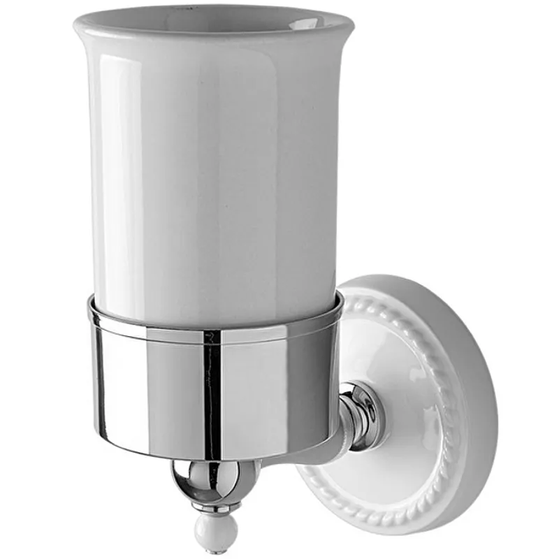 Стакан для зубных щеток Devon&Devon Dorothy DOR403CR.Характеристики: Цвет: хром, белый. Материал: латунь, керамика. Форма: круглая. Метод крепления: шурупы. Монтаж: подвесной. В комплекте поставки: Стакан. Держатель для стакана. Крепления.