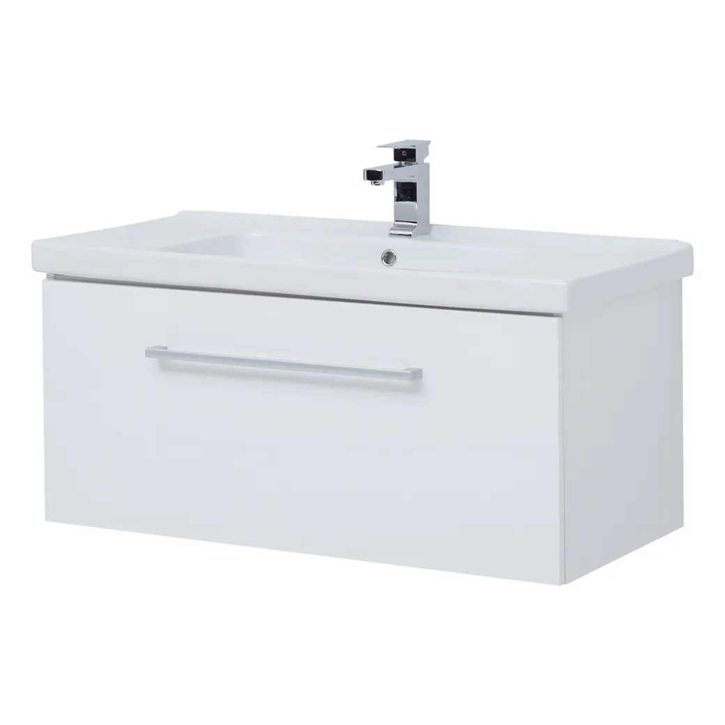 - Современный дизайн: Подвесная тумба с глянцевым белым покрытием создаёт ощущение лёгкости и простора в вашей ванной комнате.
