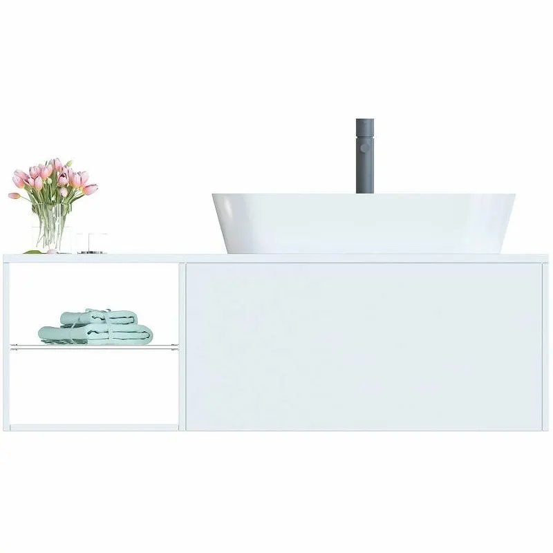 Тумба с раковиной SanVit Оскар 90 R подвесная идеально подойдет для вашей ванной комнаты, сочетая в себе стиль и функциональность. Данная модель выполнена в современном стиле и оснащена системой хранения с открытыми полками и ящиками. Подвесная установка обеспечивает легкость и простоту монтажа, делая ее идеальной для просторной ванной комнаты.