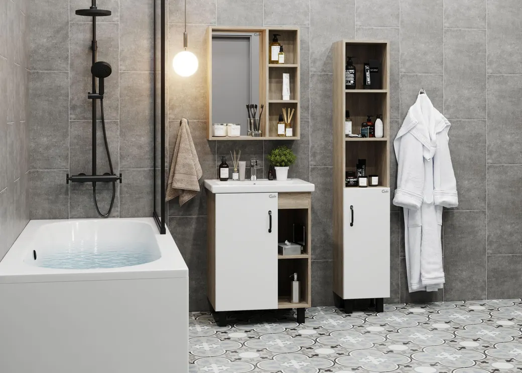 В тумбе Onika ТИМБЕР 60.01 удачно сочетаются контрастные цвета и фактуры: белый матовый фасад с покрытием SoftTouch, корпус цвета дуба с роскошной текстурой, черная матовая металлическая фурнитура. Открытые полки справа обеспечивают быстрый доступ к часто используемым аксессуарам, а пространство за распашной дверцей слева, снабженной системой плавного закрывания, станет удобным местом для хранения различных бытовых принадлежностей. Корпус тумбы выполнен из ЛДСП, фасад - из МДФ в пленке, устойчивых к механическим воздействиям, перепадам температур и высокой влажности. Черная металлическая ручка и 4 ножки (2 декоративных черных и 2 пластиковых) идут в комплекте с тумбой.