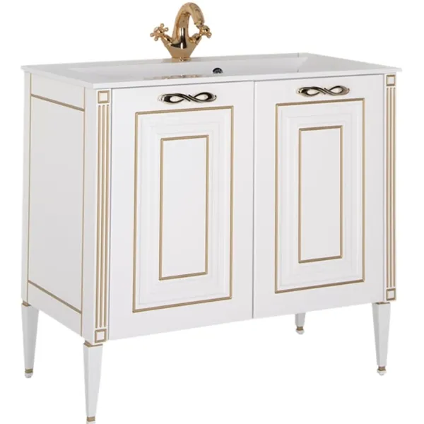 - Высокое качество и стильный дизайн: Тумба с раковиной прямоугольной формы выполнена в классическом стиле с изысканными пилястрами и золотой патиной.