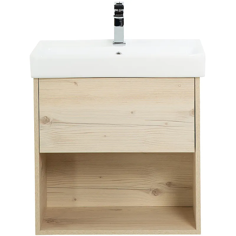 - Эргономичный дизайн: Подвесная тумба с прямоугольной формой тумбы и древесным узором в цвете Pino Bianco.