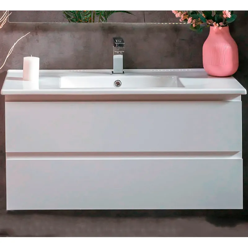 Тумба под раковину Boheme Armadi Art Capolda 100 849-100-W подвесная.Характеристики: Цвет: белый. Материал корпуса: ЛДСП, ДСП. Материал фасада: ЛДСП. Покрытие корпуса и фасада: ламинат. Габариты тумбы (ШхВхГ): 97х48х45 см. Монтаж: подвесной. Интегрированные ручки белого цвета. Система хранения: 2 выдвижных ящика с доводчиками (плавного закрывания). В комплекте поставки: Тумба под раковину.