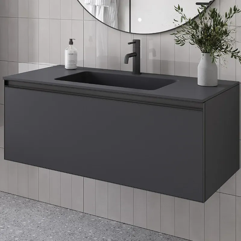 Тумба под раковину Boheme Armadi Art Quatro 1 100 790-M1-100-A-A подвесная.Характеристики: Цвет тумбы: антрацит (Anthracite). Цвет профиля: антрацит (Anthracite). Материал корпуса и фасада: МДФ. Покрытие корпуса и фасада: матовое. Поверхность: гладкая. Габариты корпуса тумбы (ШхВхГ): 1000х400х500 мм. Система хранения: один выдвижной ящик. Оснащение: механизм доводчика. Монтаж: подвесной. В комплекте поставки: Тумба под раковину.