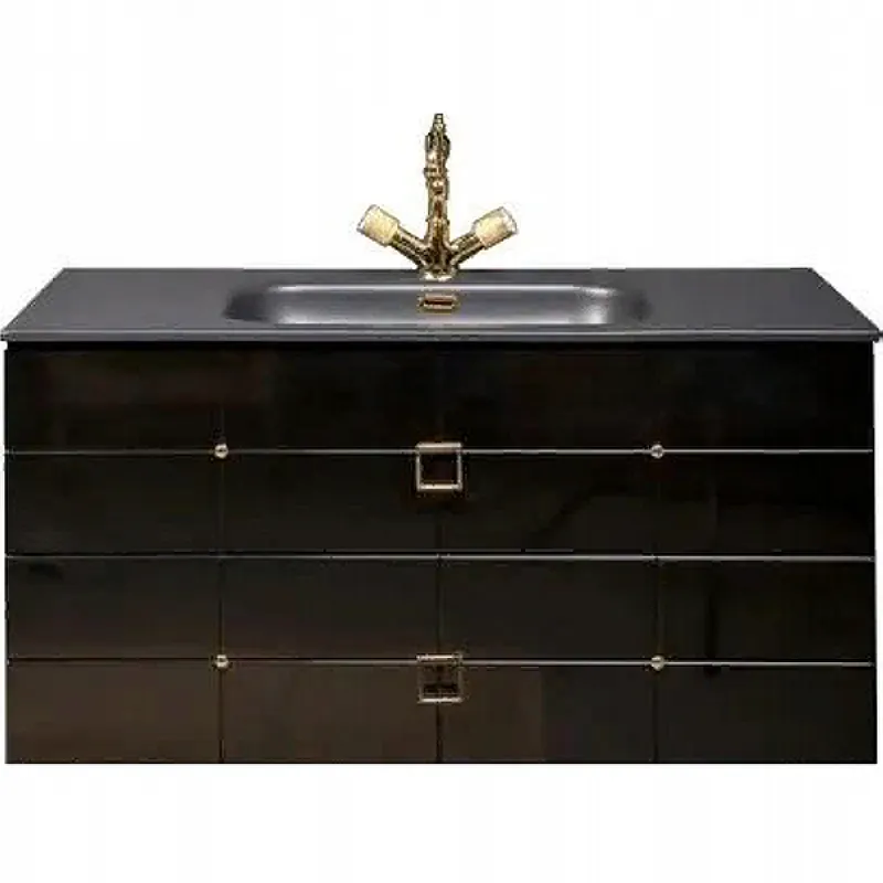 Тумба под раковину Boheme Armadi Art Vallessi Avangarde Piazza 100 841-100-BG подвесная.Характеристики: Цвет: черный глянец, золото. Материал корпуса и фасада: МДФ. Габариты тумбы (ШхВхГ): 100х48х46 см. Цвет фурнитуры: золото. Внутренняя фирменная дизайнерская отделка ящика из экокожи. Органайзер для мелких принадлежностей. Система хранения: 2 выдвижных ящика. Оснащение: механизм доводчика Hettich (плавное закрывание). Монтаж: подвесной. В комплекте поставки: Тумба под раковину.