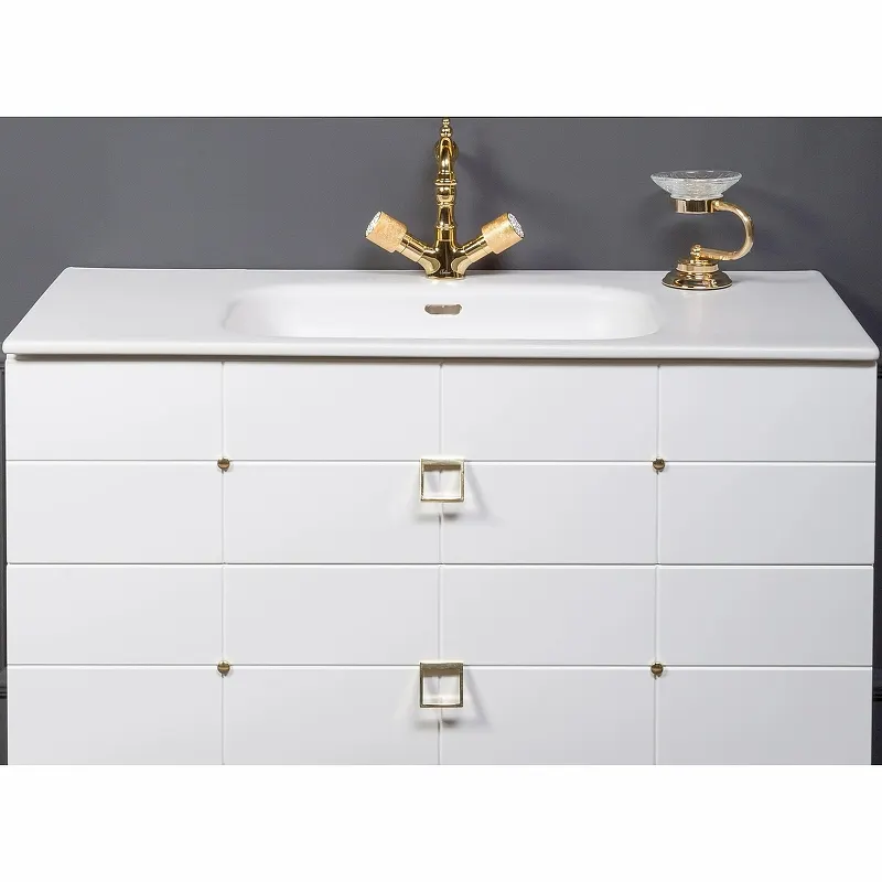 Тумба под раковину Boheme Armadi Art Vallessi Avangarde Piazza 80 841-080-WG подвесная.Характеристики: Цвет: белый, золото. Материал корпуса и фасада: МДФ. Габариты корпуса тумбы (ШхВхГ): 800х480х460 мм. Цвет фурнитуры: золото. Внутренняя фирменная дизайнерская отделка ящика из экокожи. Органайзер для мелких принадлежностей. Система хранения: 2 выдвижных ящика. Оснащение: механизм доводчика Hettich (плавное закрывание). Монтаж: подвесной. В комплекте поставки: Тумба под раковину.
