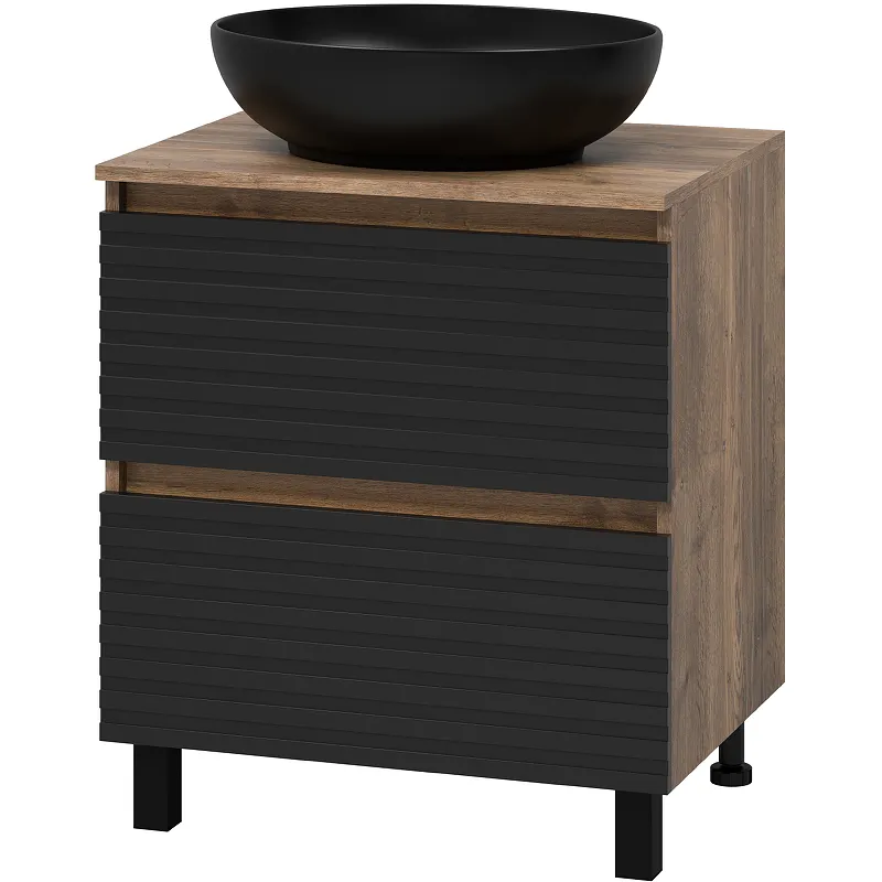Тумба под раковину Brevita Dakota 60 DAK-07060-19/02-2Я — идеальное решение для современного интерьера. Изготовленная из высококачественного МДФ и ЛДСП, она обладает стильным дизайном с матовой поверхностью, которая гармонично сочетается с черным кварцем и дубом Галифакс олово. Благодаря универсальной ориентации и системе хранения с двумя выдвижными ящиками, данная напольная тумба станет функциональным дополнением вашей ванной комнаты.