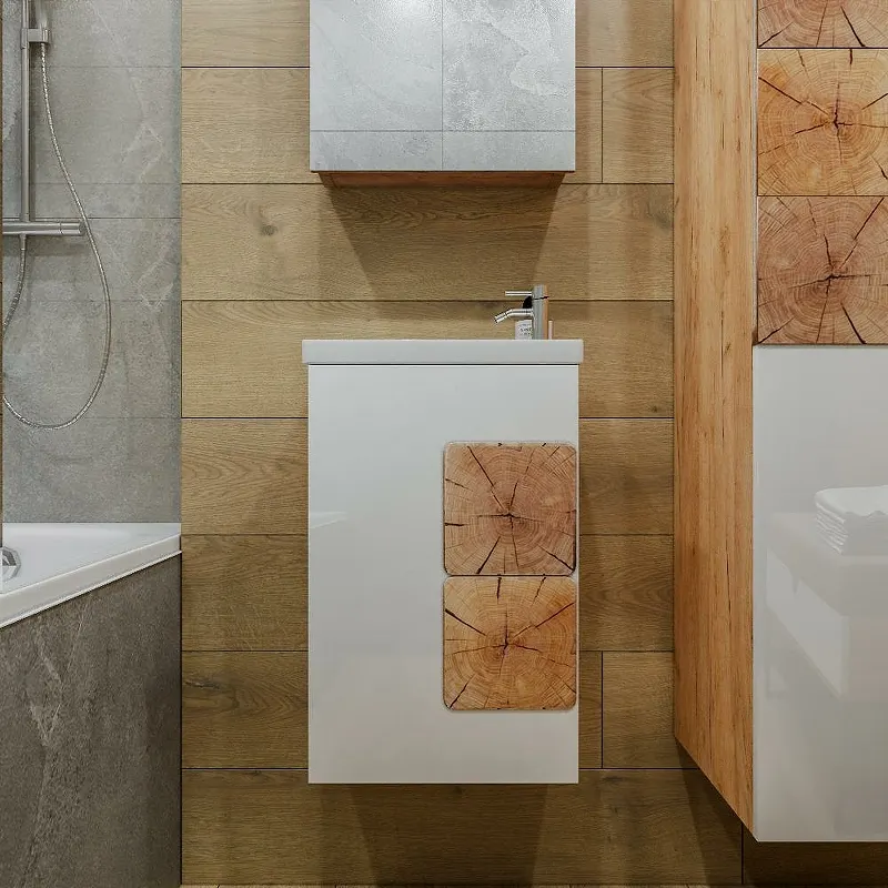 Тумба под раковину Бриклаер Форест 40 — это идеальное решение для маленькой ванной комнаты. Благодаря подвесной конструкции, данная тумба под раковину не только экономит пространство, но и придаёт современный стиль вашему интерьеру. Основной цвет — белый глянец, с элегантными вставками из дуба золотого, что делает её привлекательным элементом в любой квартире.